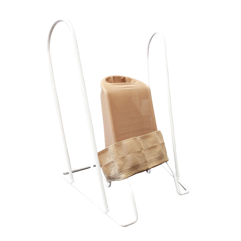 • Держась за высокие металлические дуги, поставьте носок стопы в «карман» и продвигайте ее вперед, постепенно надевая трикотаж. В процессе надевания следите за тем, чтобы пяточная часть изделия находилась на пятке.